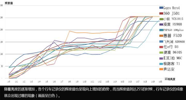 由上图可以看出,各家的行车记录仪在各个灯照强度下测试的辉度值都是不一样的,任e行 D3、奔安达、盯盯拍 M6C在光照强度LV16——LV17之间的时候,就已经出现了过曝的现象。表现最好的是极路客T1,在LV20的时候都没有出现过曝的现象。但是这里不得不提一下飞利浦ADR800,其最高辉度值只到235(理论上应为255),不知道是黑科技还是无厘头,永远不会过曝,但也无法分辨亮部细节,硬生生的砍掉了一部分亮部细节。