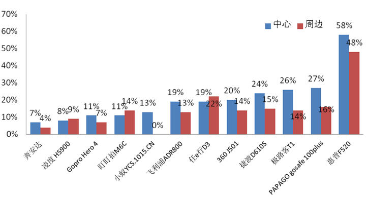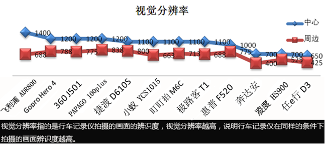 测试结果如上图所示,大部分行车记录仪成像还是比较清晰的,满足FULL HD1080P全高清的要求,但还是有一部分行车记录仪清晰度较差。一般来说,画面中心会比四角的清晰度更高,广角更是如此。