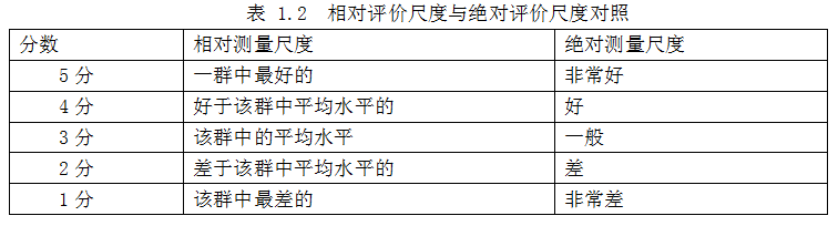 相对评价是由观察者将一批图像从好到坏进行分类,将它们相互比较得出好坏,并给出相应的评分。相对尺度如表 1.2 所示。