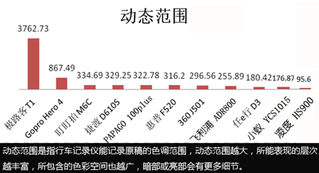 动态范围是指行车记录仪能记录原稿的色调范围,即从最黑到最亮时,行车记录仪可以分辨的最高亮度与最低亮度的比值。动态范围越大,能采集到的明暗范围会更宽广,其所能表现的层次越丰富。具备高动态范围功能WDR或HDR的行车记录仪,暗部或亮部会有更多细节。下为各行车记录仪的动态范围值: