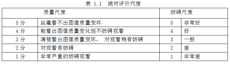 绝对评价是将图像直接按照视觉感受分级评分,表 1.1 列出了国际上规定的 5 级绝对尺度,包括质量尺度和妨碍尺度。对一般人来讲,多采用质量尺度;对专业人员来讲,则多采用妨碍尺度。