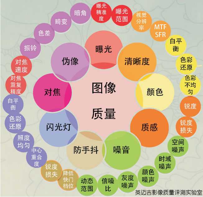 一般来说,图像质量客观评价会分成九个评测项目,曝光、清晰度、颜色、质感、噪音、防手抖、闪光灯、对焦和伪像,每一个评测项目往往还会分成好几个评测小项目,如伪像就要测试锐化、畸变、暗角这些项目。通过测试这些项目,通过科学的计算,可以非常直观地看到图像的性能的各个方面的表现有何不足。