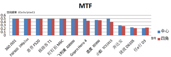 5.1 MTF 调制解调函数(静态):MTF值达到0.5,说明行车记录仪的镜头分辨率超越Sensor(传感器),则相机像素数越高,成像分辨率越高。