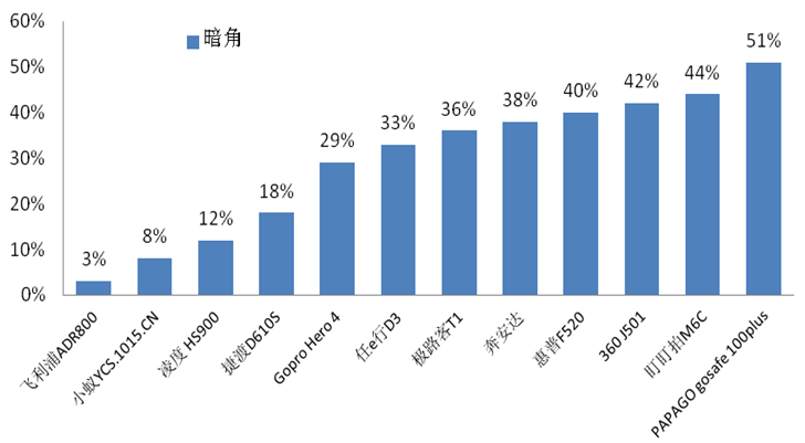 使用广角镜头拍出来的照片,往往画面的四角会较中心暗一些,英迈吉通过测试视频画面四角相对于中心亮度下降的百分比来衡量行车记录仪的抗暗角能力。