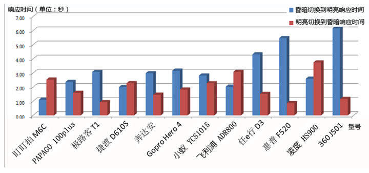 由上图可以看到,各个型号的行车记录仪从昏暗切换到明亮环境的响应时间和从明亮切换到昏暗环境的时间都不尽相同。以从昏暗切换到明亮环境为例,360行车记录仪需要6秒才能响应过来,而盯盯拍只需要1秒。