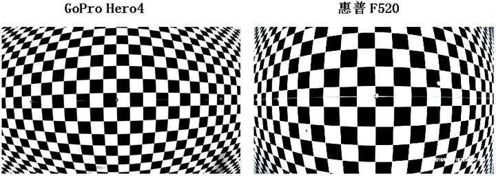 如下图,水平视场角同为118度,但惠普F520的畸变明显比GoPro Hero4大很多,其中心块所占的像素数更多,鼓出的效应也更明显。