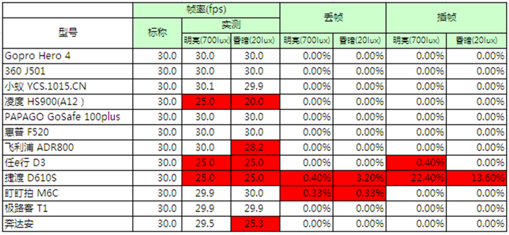由上图可以看出,大部分行车记录仪实测的帧率和标称的帧率还是大致吻合的,但是也有个别行车记录仪测试出来的帧率和标称的帧率有一定的差距。可以看到在弱光环境下,为获得更好的曝光,部分厂商做了降帧处理。