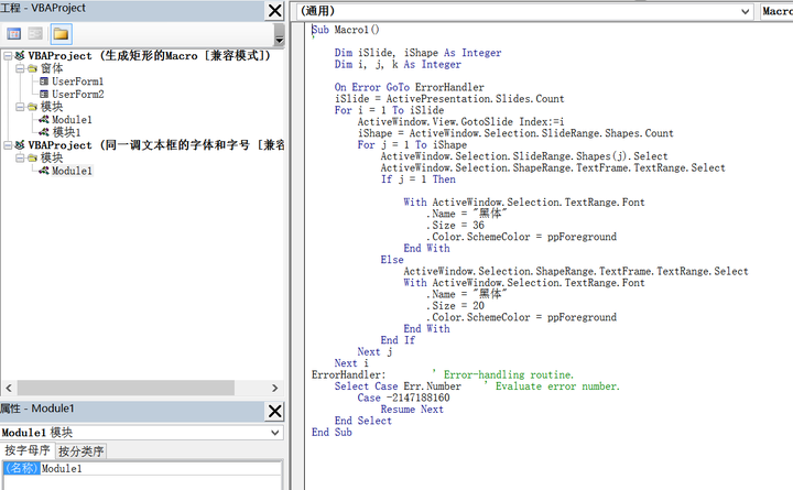 下图是利用Powerpoint中录制的宏再加上稍微修改的代码(甚至都称不上是改代码,大部分是改参数),将Powerpoint中所有的字体及字号进行统一修改。常做PPT而且需要根据老板的喜好改来改去的同学们,知道这个批处理功能有多么救命。