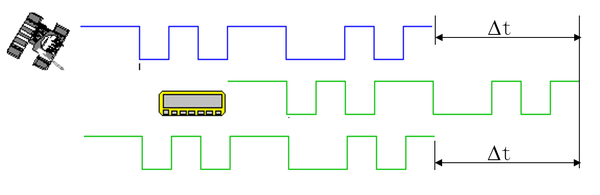 第一行蓝色的信号就是卫星发出的测距码,第二行绿色的信号是接收机按照相同算法产生的信号,很显然卫星的信号由于传输的时间延迟,在到达接收机时比接收机产生的信号落后。这时接收机会尝试将自身产生的信号与接收到的卫星信号进行比对,然后发现往后移动时自己产生的信号和接收到的卫星信号对上了(第三行绿色信号)!那么接收机就可以确定这些信号在路上用的时间是