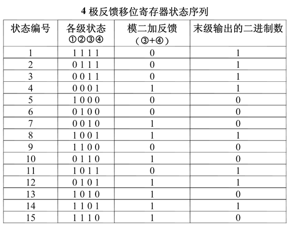 如同大部分数字电路,“多极反馈移位寄存器”的工作也由时钟控制,按照时钟周期进行动作。在工作初始时刻,多极反馈移位寄存器的每一位都在置1脉冲作用下置为1,在下一时刻,选取第三位和第四位内的数字进行模二相加(其实就是XOR异或),将得到的数字放在第一位,然后剩余数字依次后移,将4内的数字输出,连续工作时,我们就得到了下表: