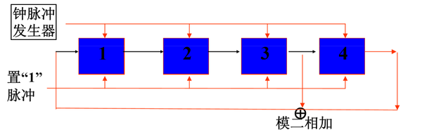 说了伪随机码的应用原理,下一步我们就要来说伪随机码是怎么产生的。伪随机码的产生是通过一个称为“多极反馈移位寄存器”的装置产生的。 如下图是一个简单的4位的“多极反馈移位寄存器”。