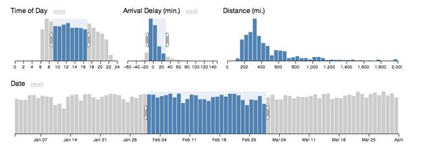 Crossfilter in action: by restricting the input range on any one chart, data is affected everywhere.