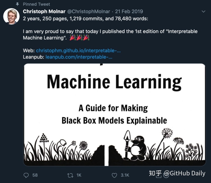 该书由德国慕尼黑大学的一名博士 Christoph Molnar 耗时两年编著完成,全书共计 250 多页,7.8 万字,1000 多次提交。