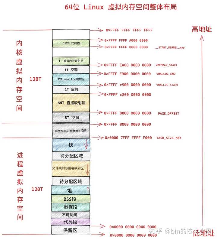 在介绍完用户态虚拟内存空间的布局以及管理之后,我们随后又介绍了内核态虚拟内存空间的布局情况,并结合之前介绍的用户态虚拟内存空间,得到了 Linux 虚拟内存空间分别在 32 位和 64 位系统中的整体布局情况:
