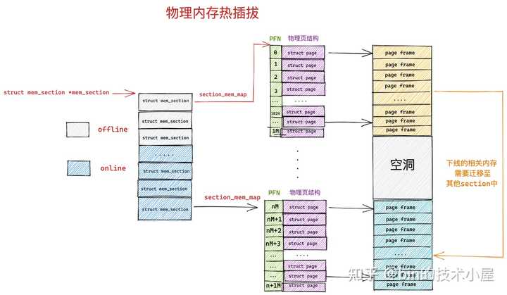 SPARSEMEM 内存模型中的这些所有的 mem_section 会被存放在一个全局的数组中,并且每个 mem_section 都可以在系统运行时改变 offline / online (下线 / 上线)状态,以便支持内存的热插拔(hotplug)功能。