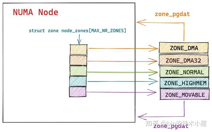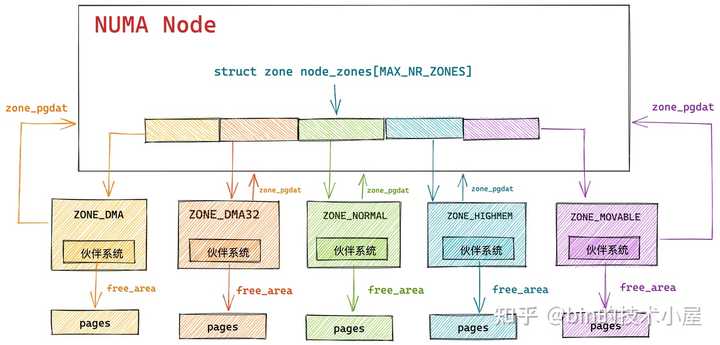 在这个基础之上,又按照内核对物理内存的组织管理层次,分别介绍了 Node 节点,物理内存区域 zone 等相关内核结构。它们的层次如下图所示: