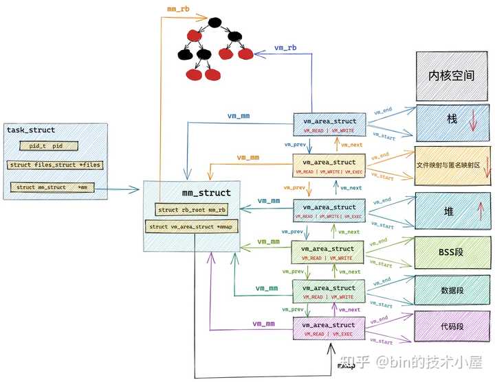 在了解了用户态虚拟内存空间的布局之后,紧接着我们又介绍了 Linux 内核如何对用户态虚拟内存空间进行管理以及相应的管理数据结构: