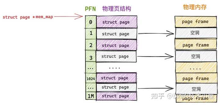 而每个 struct page 结构大部分情况下需要占用 40 字节(struct page 结构在不同场景下内存占用会有所不同,这一点我们后面再说),如果物理内存中存在的大块的地址空洞,那么为这些空洞而分配的 struct page 将会占用大量的内存空间,导致巨大的浪费。