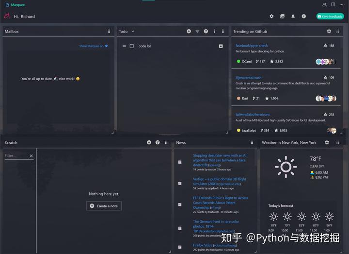 有了这个扩展,你可以看新闻报道,天气!此外,Marquee 支持用户将项目添加到个人待办事项列表中,以及一些快速笔记的暂存板。一些小但有用的插件功能。