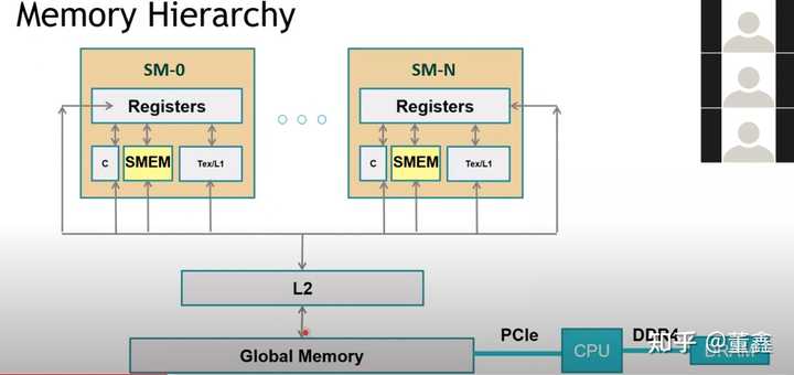 每次 shared memory 要到 global memory 找东西的时候, 会去看看 l2 cache 里面有没有, 有的话就不用去 global memory 了. 有的概率越大, 我们说 memory hit rate 越高, CUDA 编程的一个目的也是要尽可能提高 hit rate.