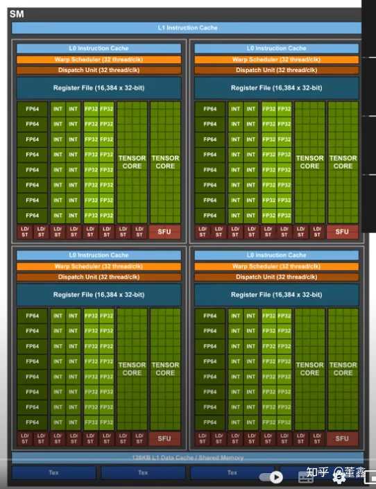 另外, 一个 SM 里面有多个 subcore (本图中有 4 个), 每个 subcore 有一个 32 thread 的 warp scheduler 和 dispatcher, 这个是跟 CUDA 编程中 warp 的概念有关的.