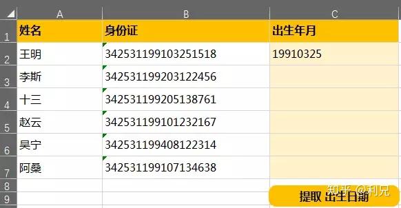 下面是一个表格,我们需要从身份证中,将出生年月提取出来。