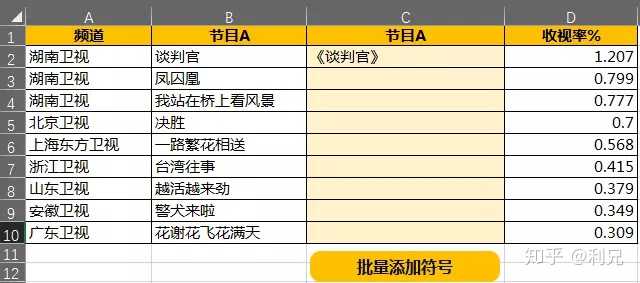 我们在边上再新建一列,在第一行直接输入“湖南卫视《谈判官》收视率1.207”。然后按快捷键Ctrl+E,即可全部生成。