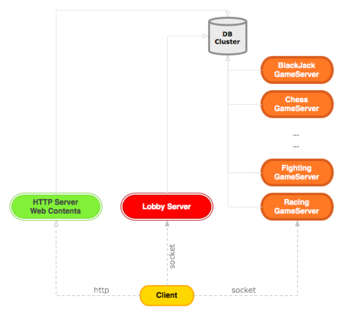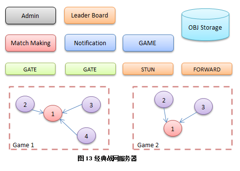 休闲游戏同战网服务器类似,都是全区架构,不同的是有房间服务器,还有具体的游戏服务器,游戏主体不再以玩家 P2P进行,而是连接到专门的游戏服务器处理: