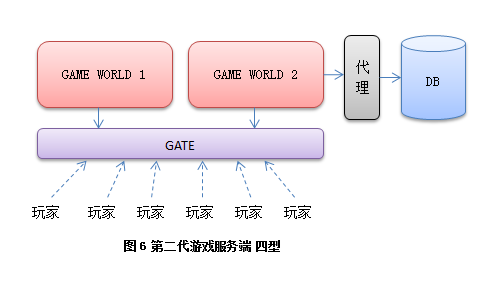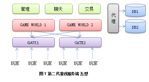 把网络功能单独提取出来,让用户统一去连接一个网关服务器,再有网关服务器转发数据到后端游戏服务器。而游戏服务器之间数据交换也统一连接到网管进行交换。这样类型的服务器基本能稳定的为玩家提供游戏服务,一台网关服务1-2万人,后面的游戏服务器每台服务5k-1w,依游戏类型和复杂度不同而已,图中隐藏了很多不重要的服务器,如登录和管理。这是目前应用最广的一个模型,到今天任然很多新项目会才用这样的结构来搭建。