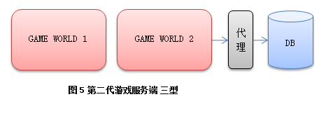 游戏服务器压力拆分后得意缓解,但是两台游戏服务器同时访问数据库,大量重复访问,大量数据交换,使得数据库成为下一个瓶颈。于是形成了数据库前端代理(DB Proxy),游戏服务器不直接访问数据库而是访问代理,再有代理访问数据库,同时提供内存级别的cache。早年 MySQL4之前没有提供存储过程,这个前端代理一般和 MySQL跑在同一台上,它转化游戏服务器发过来的高级数据操作指令,拆分成具体的数据库操作,一定程度上代替了存储过程: