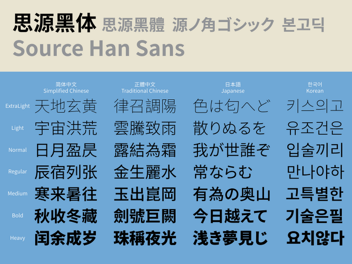 经过长达一点年半的研发,Adobe 联合 Google 于 2017 年 4 月 3 日发布了思源宋体( Source Han Serif,Google 称 Noto Serif CJK)。和思源黑体一样,思源宋体以 “SIL 开放字体许可证” 开源发行,且同样含简繁日韩四种汉字写法和七种粗细字重给出。