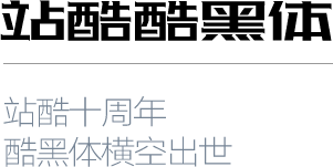[站酷酷黑体验版]在站酷十周年之际横空出世。字形笔画粗犷有力,用宽扁型的字面构建出厚重的字体形态,笔画细节上的修饰既增强了字体的设计感,又让字体多了一些小小的精致感,中宫的饱满使得文字之间的排版组合非常醒目好看。2016年7月发布体验版。
