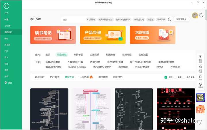 这个是我特别喜欢的功能之一,特省事!你可以理解为PPT模板那样,mindmaster准备好了多行业多岗位的思维导图模板。