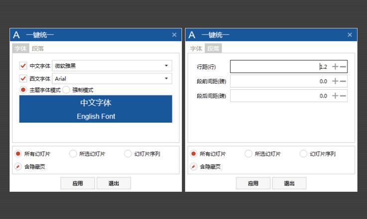 一键统一PPT中的字体和段落:能全文档统一中/英文字体;全文档统一行距/段前/段后距(不用再一篇一篇改字体了:)