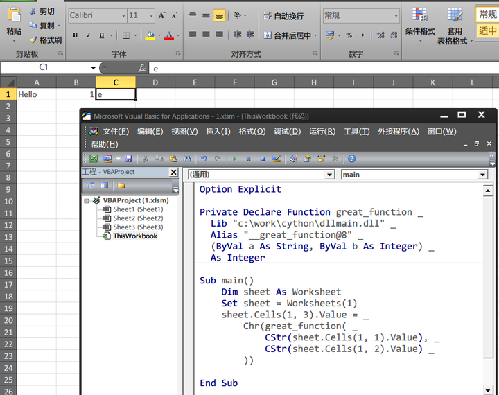 会得到一个dllmain.dll。我们在Excel里面使用它,没错,传说中的Excel与Python混合编程: