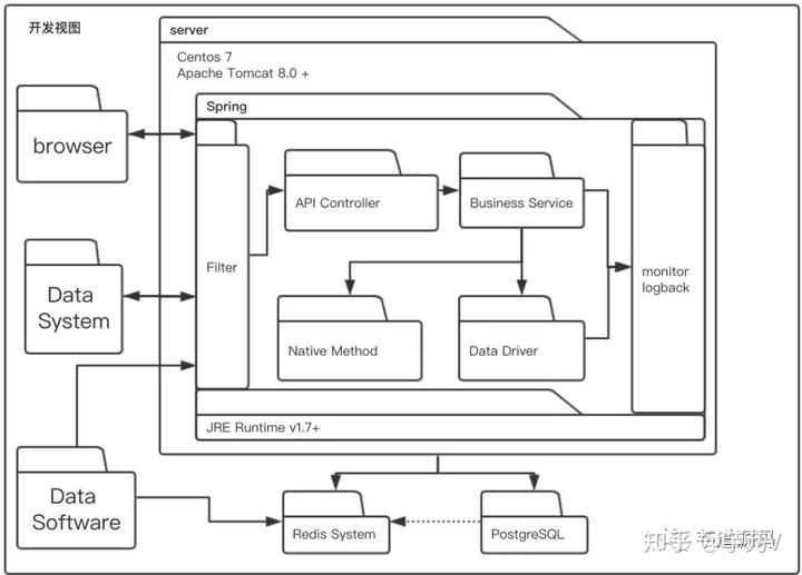 开发视图用于描述系统的模块划分和组成,以及细化到内部包的组成设计,服务于开发人员,反映系统开发实施过程。