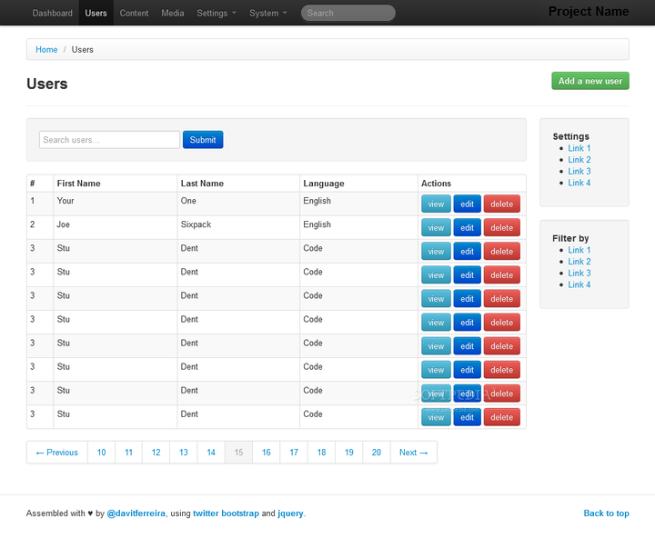 基于bootstrap或者其他1级框架,然后集成了各种jQuery插件、富文本编辑器等js库,组成的一个大杂烩工具包和案例库。皮肤基本是基于bootstrap自定义的一套主题。案例比较详尽,开发的时候找到需要的组件把前端代码复制粘贴,再稍微调试一下就能达到良好的视觉效果。根据集成的第三方库的多少,基本可以划分到3~4级封装度这样的范围。这个级别的框架的代码更多的是属于粘合剂,将各种不同的第三方库的前端代码粘合起来。经典页面大概是这样: